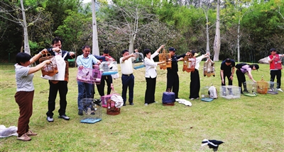 当天,随着放归活动启动,志愿者一一打开笼门,鸟儿挥翅飞出,快速掠过半空、飞向山林。被放归大自然的鸟儿,既有红隼、画眉、鹩哥等国家二级保护动物,也有八哥、鹊鸲等“三有”保护动物。